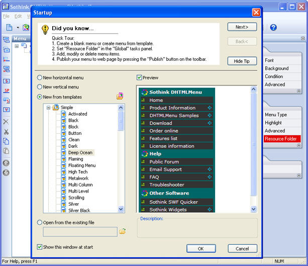 1. When you launch Sothink DHTML Menu, it will pop up a window to ask you to choose templates, so pick up the one you like among them for script drop down menus. With the plentiful templates in the program, pretty and fashionable script drop down menus are easy to get.